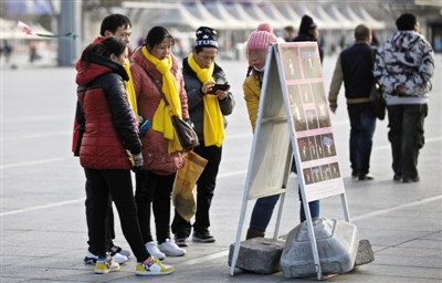 游商向游客介绍照片价格。近日,有游客称,鸟巢周边有游商收取照相费后,强行向游客收打印费。新京报记者周岗峰摄