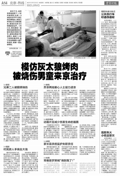 平平、安安家住江苏省连云港市东海县石榴街道麻汪村。今年4月6日下午5点多,兄弟俩与10岁的邻居顺顺在村边树林里模仿动画片《喜羊羊与灰太狼》中烤羊肉串的剧情,做“绑架烤羊”游戏。顺顺把平平、安安绑在树上,并点燃了地上的树叶。经诊断,平平全身多处烧伤40%,安安全身烧伤80%。5月7日,兄弟俩因病情危重转至北京市304医院继续治疗(本报5月8日曾报道)。