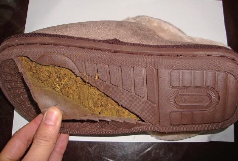 12月16日上午,在押人员周某某的家属来到平阳看守所物品收押室,称天气转冷了,来送棉拖鞋。值班民警检查发现,鞋底的夹层里藏有大量的烟草,约0.5公斤重(如图)。