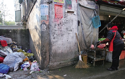 在东方路一带,一家工厂将废料直接放在厂门外,记者掀开挡住墙角的编织布,发现有近10大袋垃圾。而在另一侧巷内,面向慈凤路的几家餐饮店后门,污水遍地,卫生条件极差。建筑废料被堆在墙角,仍未清理。