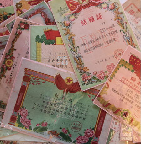 叶建国说,他曾到过北京、河南、广州等地的收藏品市场和旧货市场去淘结婚证,“毕竟是婚书,一般是不会卖的,更多的是夹在一些旧书或杂志里,被一起卖掉的。”