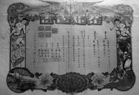 “民国时期,虽然也有婚姻法,但一夫一妻制还是有名无实。婚书的规格也并不统一,往往大户人家或是书香门第讲究婚书。”潘一钢说。民国的婚书又称“鸾书”“八字帖”等,可以理解为当年的“结婚证”。民国时期的婚书往往用描金鸾凤朱纸,依男左女右次序,分书男女姓名、生辰八字、籍贯、祖宗三代名号,外有封套,上有“天作地合、文定厥祥”“鸾凤和鸣、珠联璧合”等吉祥语,并装饰有“双仙和合”、凤凰和百子图等中国传统文化元素,期盼人丁兴旺。