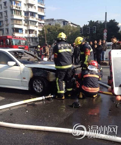 据当时参与救援的温州银行保安郑先生回忆说,事发时他正在银行内执勤。当时,听到有人来冲进来问“有没有灭火器”,他才知道外面起火了。于是,他就拿着银行内的灭火器,赶到事故地点,朝冒烟的车头位置一阵猛喷。“由于起火位置在车里面,所以用了两三个灭火器都没有把火灭掉,反而有越来越大的趋势。”