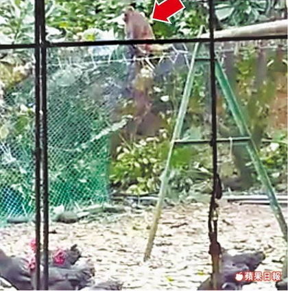 看好戏猕猴(箭头处)虐杀50多只鸡后,还嚣张地坐在围栏上看好戏。