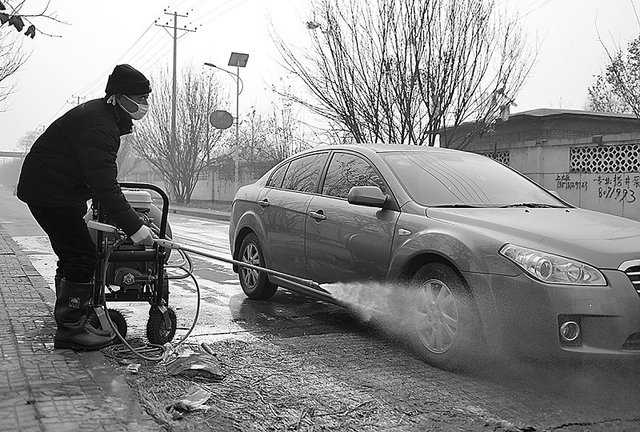 居民正在给汽车消毒