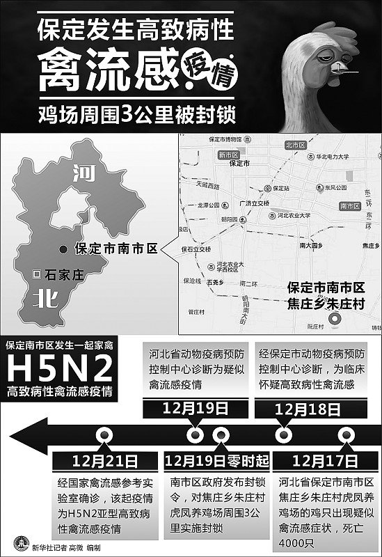 12月17日,保定南市区朱庄村虎凤养鸡场4000只鸡异常死亡。21日,经国家禽流感参考实验室确诊,该起疫情为H5N2亚型高致病性禽流感疫情。