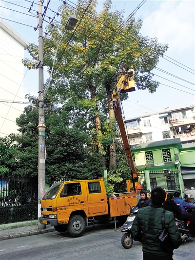 听说隔两年还得重新修剪,不少人的脸上拧成了一个“愁”字。社区工作人员说,这几棵树的日常修理归社区,可是没有高空升降车,社区怎么修剪它们呢?请“外援”又要层层报告,就拿这次来讲,除了向区园林部门申请外,同时请交警封道,请电力部门帮忙关闭电源,并且造成居民家中长时间停电,实在劳师动众。