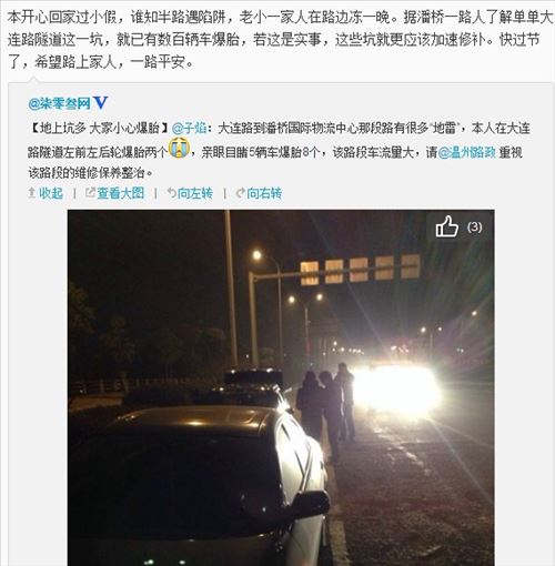 (记者温婉) 5辆车经过潘桥镇附近的“大连路”接连爆胎8个?这是网友@子焰近日在微博上吐槽,该网友12月21日晚驾车经过大连路时,遭遇路面坑洼导致爆胎。