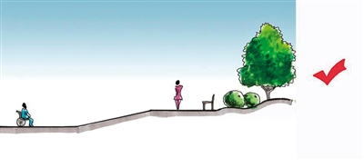 车行道分隔带,是城市道路的视觉重点。导则提出,绿化分隔带方面,交通性的主干路中间分隔带的宽度要在3米以上,宜种植胸径大于10厘米的乔木并加灌木;生活性与景观性的主干路两侧,分隔带的宽度在2.5米以上,绿化配置应多样。防护栏方面,交通性主干路中间防护栏应设置混凝土护栏基座,宜为25(高)× 50(宽)厘米,护栏高度宜为110厘米;生活性与景观性的道路护栏可采用温州地域文化题材的画面装饰,护栏高度不宜小于80厘米。
