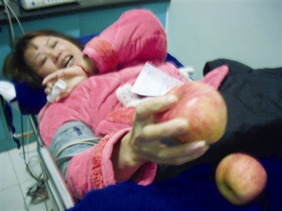 昨晚9时50分许,在家看福彩节目的吕女士看得正欢,便拿出事先买好的苹果让丈夫和儿子吃。“我儿子原先不想吃的,是我说节日里图吉利,再三要求他吃的,结果儿子吃了半个,老公吃了一个。”躺在附二医急诊室病床的吕女士说起此事,眼里噙着泪花。