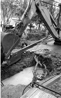 30年樟树顶裂5厘米厚水泥管道 自来水流一地(图)