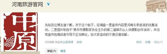 昨日,河南旅游资讯网官方微博发布消息:“旅游省钱都看这里!冬游河南优惠大攻略”,微博配图为三张裸露上身长发披肩的女子,在神农山碑前摆拍的照片。该微博随即引来众网民围观。