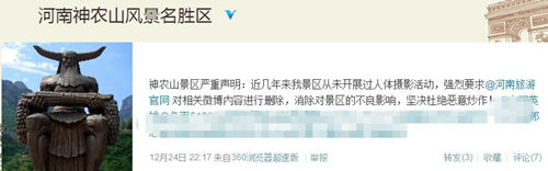 另外,昨晚,河南神农山风景名胜区管理局官方微博发布声明称:“近几年来我景区从未开展过人体摄影活动。”