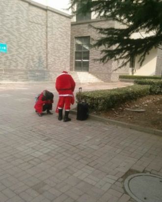 人人网网友“汤兵Andy”上传了几张照片,他说,2013年的圣诞节,南京工业大学的AB楼附近,一位父亲装扮成圣诞老人来看望自己的女儿,女儿顿时泪奔了。从上传的图片中可以看到,这位父亲拖着行李箱在一座楼旁边的花坛前等待女儿,他全身穿着圣诞老人的衣服,戴着圣诞帽,还穿着大大的黑靴子,手中像模像样地提着一个红色的袋子,扬子晚报记者看到,这位爸爸戴着眼镜和大大的浓密的假胡子,几乎遮住了整个脸。