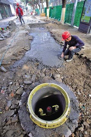 正在铺设人行道路面的陈师傅说,施工在十几天前就已经开始了。把路面挖开再重新回造,就是为了更换埋在这段路下的燃气管道。