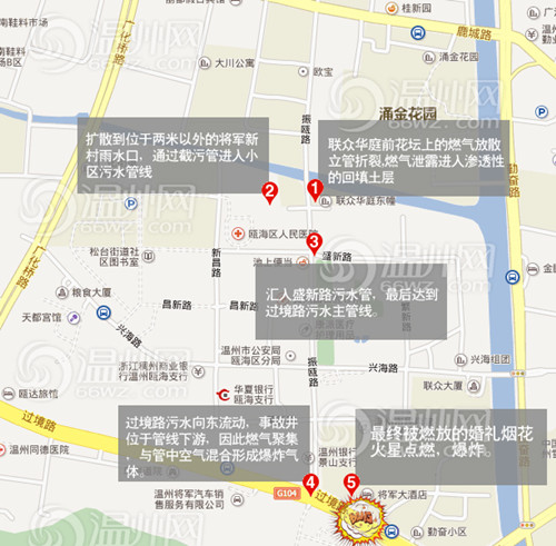 12月31日专家组初步判定事件可燃气体是振瓯路燃气管道泄露。2014年1月2日下午,市燃气公司在联众华庭前方(公园假山后侧)找到泄漏点。1月3日,对燃气泄漏点靠近将军新村的雨水口井用二氧化碳气源检查,结果确定泄漏点的燃气经雨水管进入污水管网。