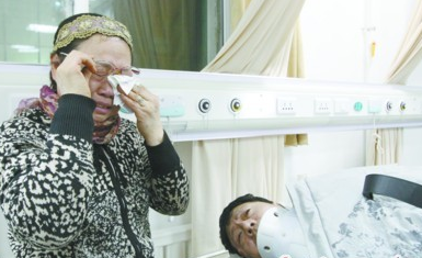 昨晚8时30分许,在沈阳市第五人民医院急诊大厅内,王国华已经恢复意识,老伴黄阿姨守在病床旁看到王国华的伤势,非常伤心。王洋摄