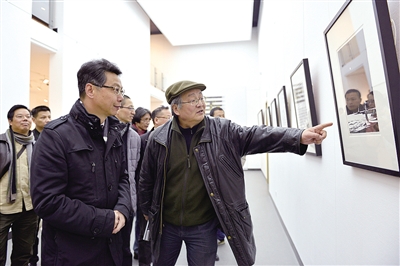 乐清市委副书记、市长林晓峰(左一)和张远帆(著名画家张怀江之子)在参观画展。郑剑佩摄