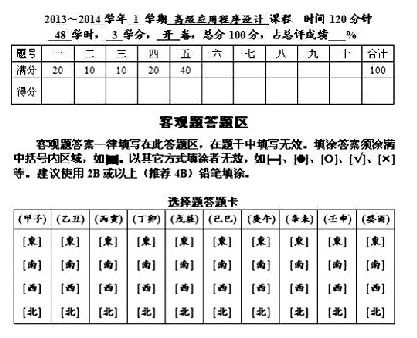 打开试卷答题卡,发现题目序号变成天干地支,选项变成“东南西北”,你还能淡定么?记者昨日在武汉理工大学看到,这份神奇的答题卡透出浓浓的中国风,可让人意外的是,考试科目却不是古汉语,而是《高级应用程序设计》。