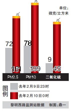 根据温州市环境监测中心站黎明西路监测站数据显示,去年除夕夜,由于烟花爆竹的集中燃放,对空气质量造成了短时间的巨大影响,二氧化硫、PM10、PM2.5等数据瞬间飙升,浓度上升了一倍以上。