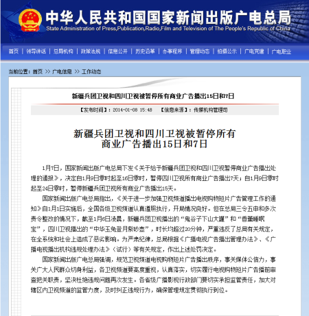 1月7日,国家新闻出版广电总局下发《关于给予新疆兵团卫视和四川卫视暂停商业广告播出处理的通报》,决定自1月9日零时起至16日零时,暂停四川卫视所有商业广告播出7天;自1月9日零时起至24日零时,暂停新疆兵团卫视所有商业广告播出15天。