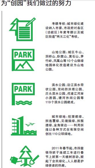我市自2010年以来以“六城联创”为总载体,按照“生态建设、绿化先行,六城联创、种树当先”的工作思路,积极动员全市上下打响“绿色战役”,深入开展园林城市创建工作取得阶段性成果,已于日前正式被省政府命名为“浙江省园林城市”。