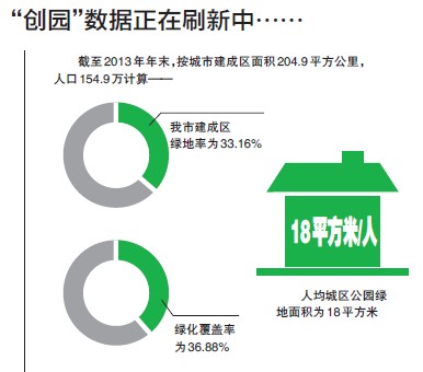 市城管与执法局局长、市创园办主任李世斌介绍,2010年至2012年的三年,我市共新增城区绿地3008公顷,新增公园绿地1118公顷,绿地率、绿化覆盖率、人均公园绿地面积分别增长了11.88%、13.76%和6.86平方米。截至2012年年底,按照建成区面积204.9平方公里,城市人口154.9万人计算,我市建成区绿地率达31.88%、绿化覆盖率达35.6%、城区人均公园绿地面积达到12.91平方米,城市形象、生态建设、人居环境明显改善。