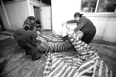 动物园工作人员将东北虎尸体重新包裹,暂存冷库保存。刘伟赵用通讯员蔡剑平摄