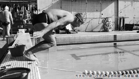 前几天,81岁的方绍周像往常一样来到市区东瓯游泳池,简单热身后,跃入池中,在50米的泳道上来回游了8趟。