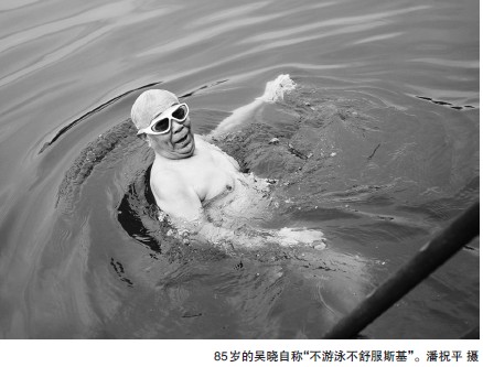 吴老伯冬泳坚持二十多年了,每天起床后冬泳几圈成了一天开始的标志。2010年冬天,吴晓还作为温州的五个代表之一,去莫斯科参加冬泳活动,那是他游过最冷的一次,气温只有-20℃。当时81岁的他也是在场年纪最大的一位,许多外国人都啧啧称奇。吴老伯风趣幽默地称自己的俄文名字叫“不游泳不舒服斯基”。