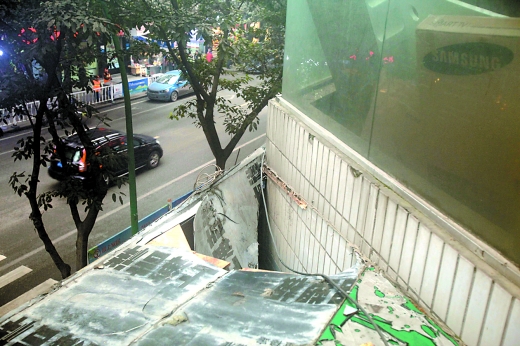国美电器的员工李贵川领记者来到其中一间作为仓库的房间,从窗户那里,可以看到一层雨塑板,小龙正好跌在板子上,砸破了一块板子后,缓冲落在了大门前的灯箱里。