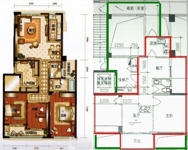 (红线内为89平米实际套型,绿色为消防通道、采光井违建纳入之后的部分)
