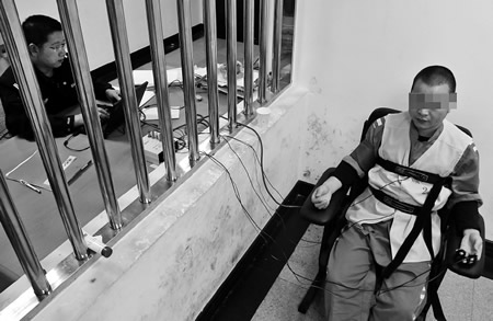 测谎专家卢劲松正在对犯罪嫌疑人林某进行测谎。温都记者姚卡/摄