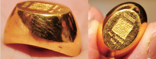 前几天,记者见到了这枚生锈了的金元宝,在金元宝底部,可以清楚地看到元宝标有“中国黄金”字样,编号是1066883,重量为50g,纯度为4个“9”即99.99%纯度。同时,就在“中国黄金”字样的右上角却可以清楚地看见有一个米粒大小的暗红色斑痕。此外,该金元宝的侧面也有两三处锈斑。