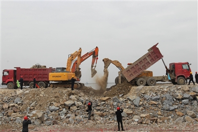 项目业主单位、温州龙达围垦开发建设有限公司总经理陈志标说,需要堵口的地方在主堤上有3处,每个缺口约300米宽,它们将被石料填平收窄。这是个逐步实施的过程,大致可分为两个阶段:去年9月龙口开始收窄,等到最后100米时,一次性用四五个小时完成冲刺。