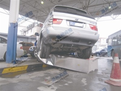 昨天上午,温州市区江滨东路公交加油站内,一辆准备加油的宝马X5越野车失控,撞翻加油机后“骑”了上去。现场处理事故的交警说,事故的原因是宝马车驾驶员把油门当刹车。