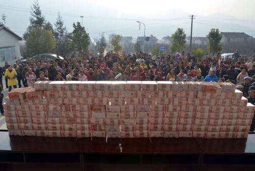 【年终分红,“土豪”们喜领1300余万现金】今天上午,凉山州冕宁县复兴镇建设村召开2013年分红大会,分红金额达1311.5万元。现场,重达312斤的人民币现金一捆捆整齐地放在台上,340余户入股村民排队领钱,最多的一户领到了30万元,最少的也有近万元。有村民说,数钱数到手都软了。