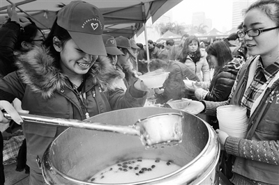 “免费热粥,欢迎品尝!”那边,志愿者在卖力地吆喝。现场负责人卢晓敏告诉记者,他们凌晨三点就起来熬粥了,一个长炉上放两个大锅,要熬到下午两点半。为了保温,他们踩着三轮车,每个小时送来两大桶热气腾腾的红枣粥。“我参加‘春运关爱’活动已经整整六年了,这样的好事值得一直做下去。”卢晓敏说。