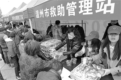 在温州火车站的春运关爱行动现场,志愿者们为返乡旅客送上热腾腾的红枣粥和面包、矿泉水等。苏巧将摄