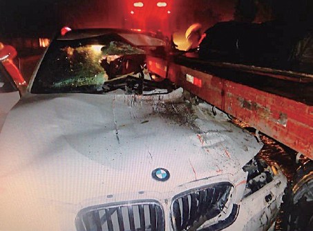 据交警四大队提供的监控,13日晚11时4分,一辆悬挂安徽牌照的红色半挂车靠道路右侧行驶,货车左侧有一辆车子正在行驶。随后,一辆白色宝马X3越野车一头撞上半挂车后部。