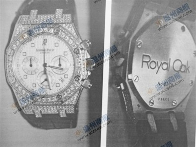 众赃物之中,唯有这只“爱彼”牌“皇家橡树”系列的手表最为奢华贵重。表盘和表扣是18k纯白金材质的,表带是纯手工缝合的鳄鱼皮表带,手表上面镶满了钻石。经物价部门鉴定,该表价值30万元。