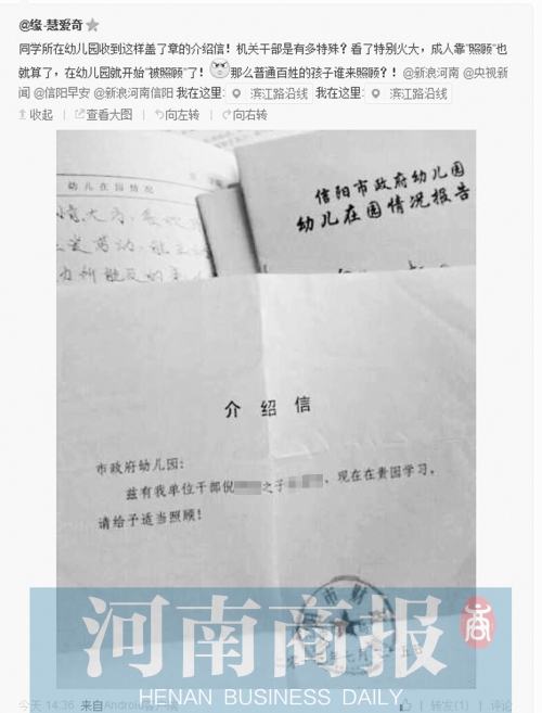 昨日,网友“缘-慧爱奇”发微博称,信阳市一所幼儿园收到一封盖有政府部门公章的介绍信,信中称让该幼儿园对孩子“给予适当照顾”。微博发出后,引起了网友们的讨论。