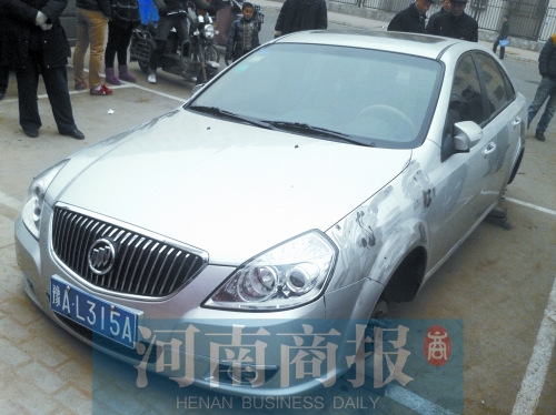昨日上午9点左右,郑州市丰庆路与王寨路交叉口向东300米路北,一辆白色的别克车显得与周围的“小伙伴”极为不同,车体右前侧已经磕到了路沿儿上,4个轮子没了踪影。每个车轮的位置都垫有砖头。