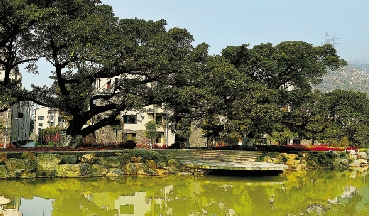 穿过古榕石桥,踏上柏油马路,展现在我们眼前的小院可真美:别墅式的小院绿树环绕,潺潺的天然流水穿过,一派江南园林美景。