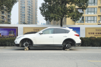 浙江在线01月19日讯昨日上午,在台州椒江东京湾小区西面京沚街围墙旁,一辆白色的英菲尼迪QX50型号SUV引起了过路市民的关注,这辆车子四个轮子都不翼而飞,只剩下空荡荡的轮框。