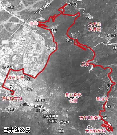 茶山始发站-朝阳新街-高教园区-温州大学东大门-高教园区公交站-创新路口-南柳社区-舜岙-茶山后京-汀岙-徐岙-新民村-下坦平-京山村-岭头-侨乡亭-大茶山村-龙潭村-洪岩村-香山寺-石竹(龙脊)-光岙始发站