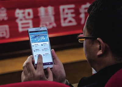 昨天,全国首创“智慧医疗”手机门诊等平台在温医附一院举行新闻发布会。图为一市民在试用手机APP。赵用摄