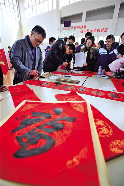 昨日上午,温州百名书家与学生共写春联。刘伟摄