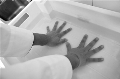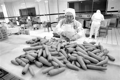 前日7时50分许,主厨刘师傅用手逐一翻检塑料筐内的蔬菜,过磅后,蔬菜类食材将进入分拣间清洗、切割。一名工人将整筐带泥的胡萝卜倒入蔬菜清洗机。10分钟后,洗净去皮的胡萝卜便被倒入塑料筐。