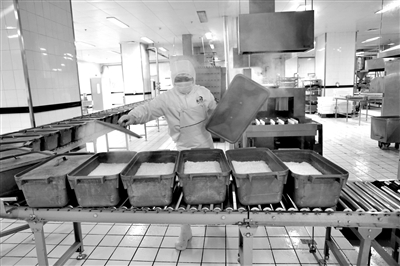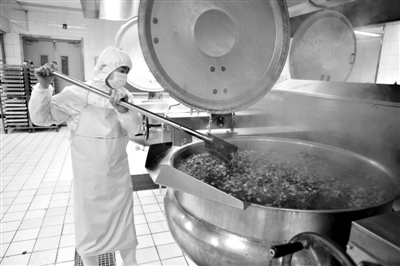 热厨加工间内的职工则负责操作蒸汽锅、搅拌锅等,按比例将菜和调料放入锅内烹制。“我们研制出了独家配方的调料。”主厨孙师傅介绍,只要工作人员按照设计好的流程完成操作,就可以保证菜品味道一致。“你做也是这个味儿。”孙师傅笑称。